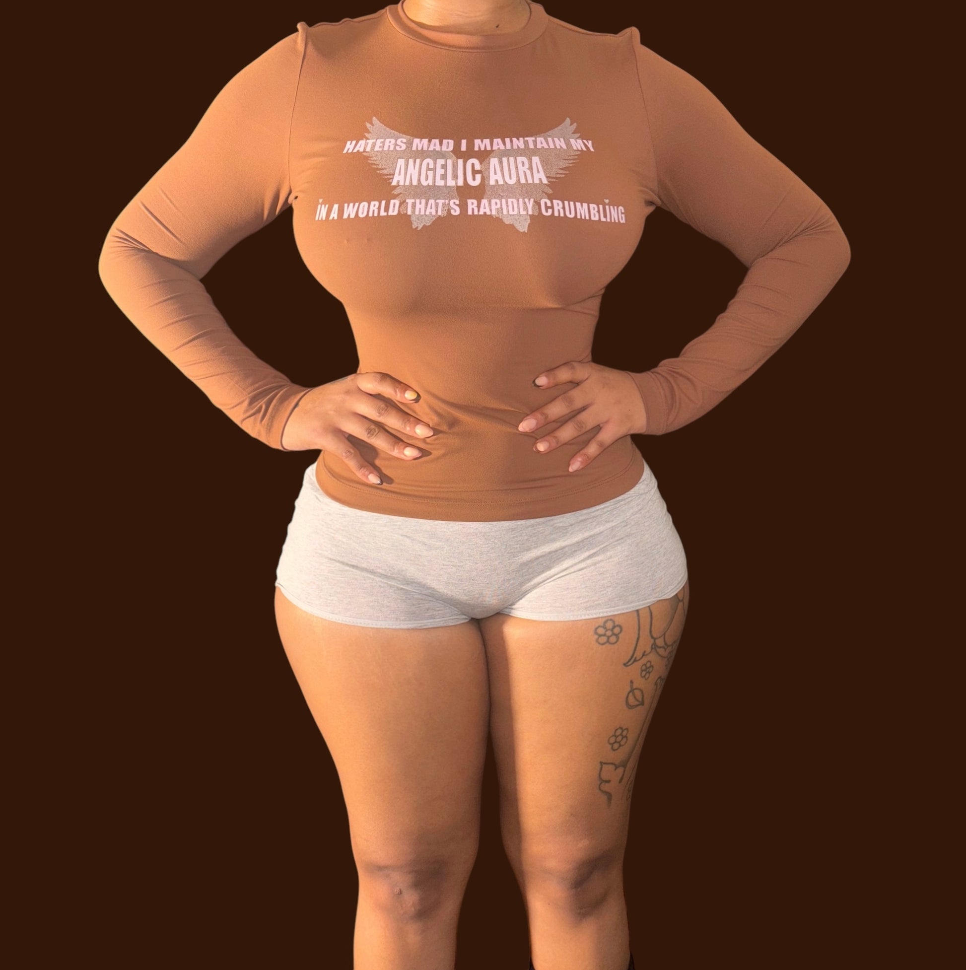 You move different—soft but untouchable, glowing but never to be played with. The “Haters Mad I Maintain an Angelic Aura in a World That’s Rapidly Crumbling” sculpting shirt is built to snatch, sculpt, and serve body, giving that effortless sexy but unfazed energy.